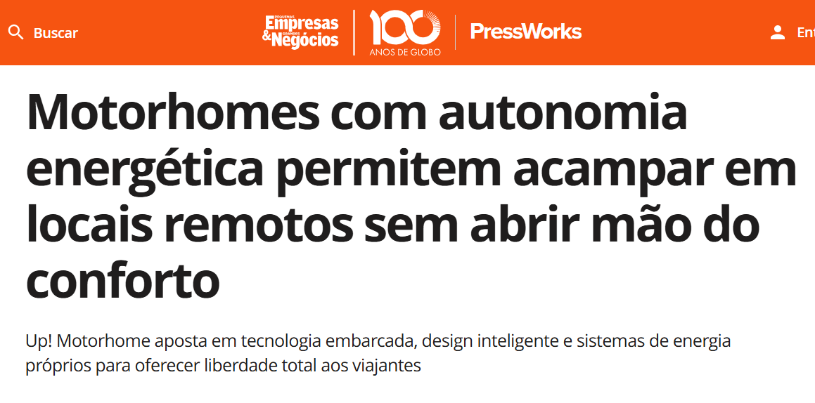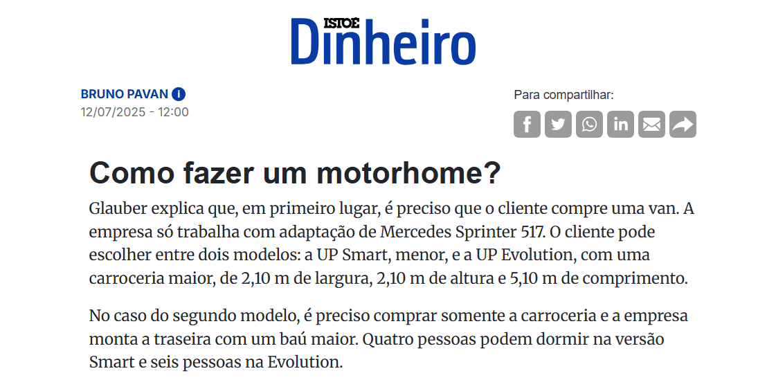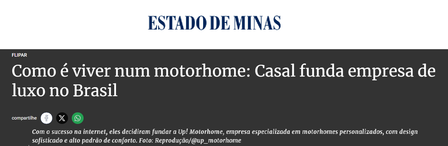Como é viver num motorhome: Casal funda empresa de luxo no Brasil. Com o sucesso na internet, eles decidiram fundar a UP! Motorhome, empresa especializada em motorhomes com design sofisticado e alto padrão de conforto. A empresa utiliza como base (Mercedes-Benz Sprinter ou Ford Transit), com preços a partir de R$ 265 mil, oferecendo sistemas completos, isolamento térmico e eletrodomésticos.