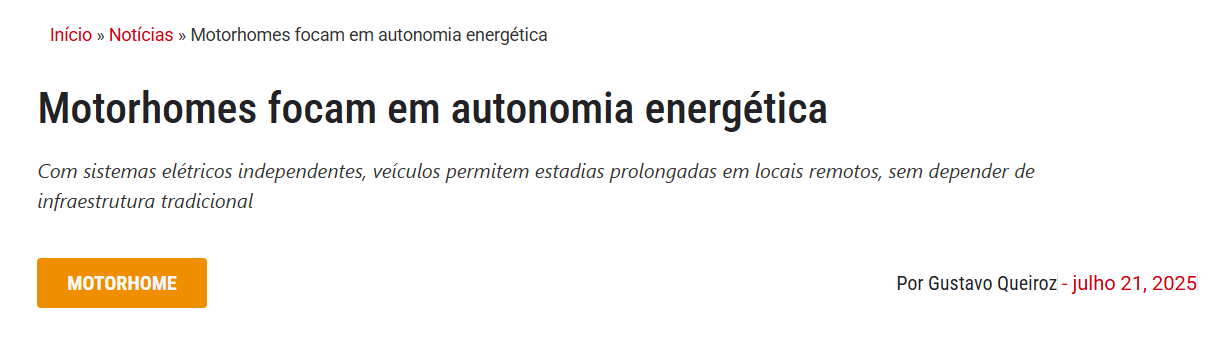 Motorhomes focam em autonomia energética. Com sistemas elétricos independentes, veículos permitem estadias prolongadas em locais remotos, sem depender de infraestrutura tradicional. A Up! Motorhome, fabricante mineira, aposta no conceito com veículos equipados com sistemas autônomos de energia e infraestrutura completa. Projetados para funcionar mesmo em locais sem rede elétrica, os modelos da marca contam com baterias de lítio LiFePO₄ de alta performance, painéis solares e um sistema de monitoramento digital que garante autonomia energética por dias ou semanas.